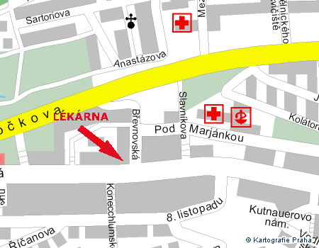 Lékárna U Kaštanu se nachází téměř na rohu ulic Bělohorská a Břevnovská, přímo proti ústí ulice Konecchlumského. Přímo u zastávky tramvaje č. 22 a 25.